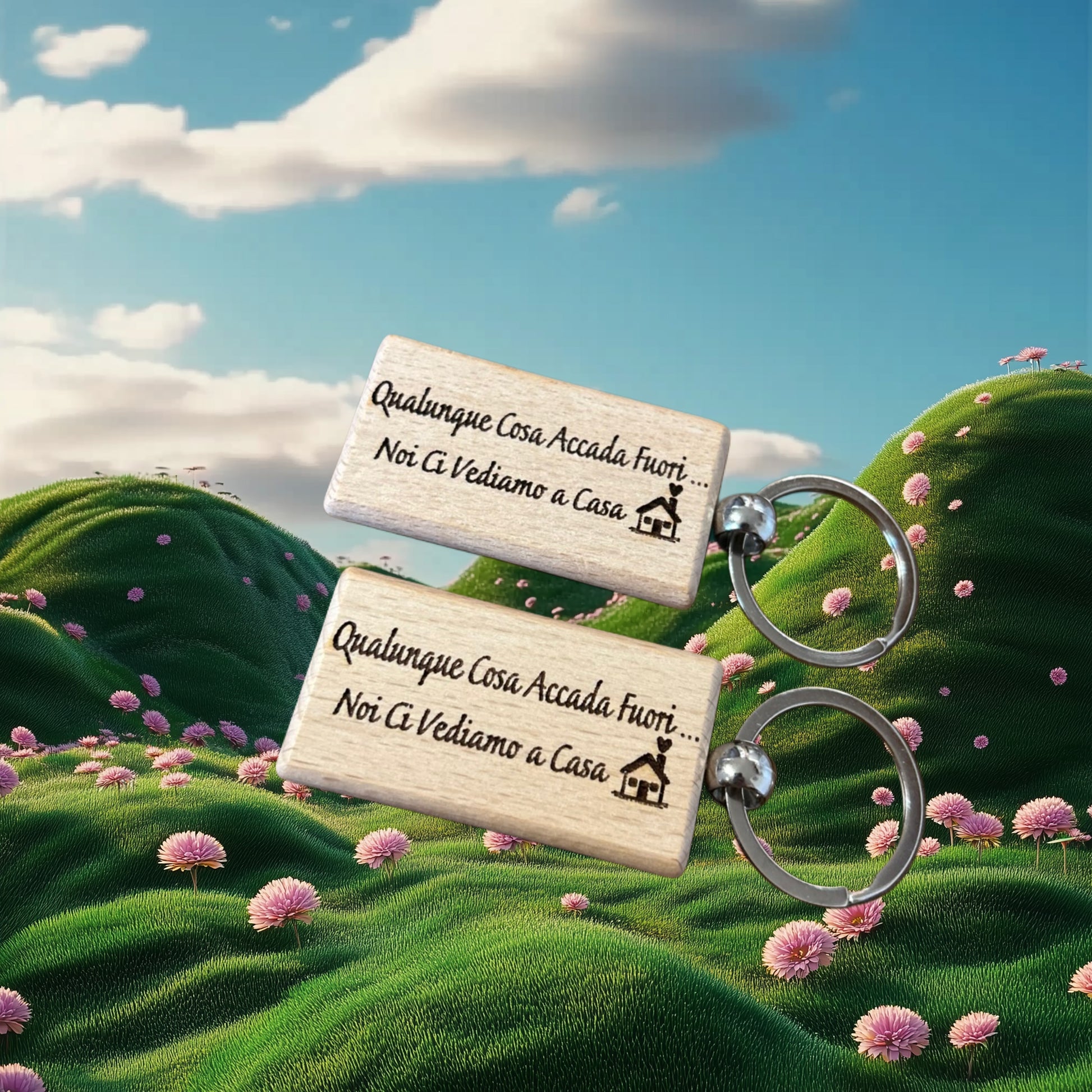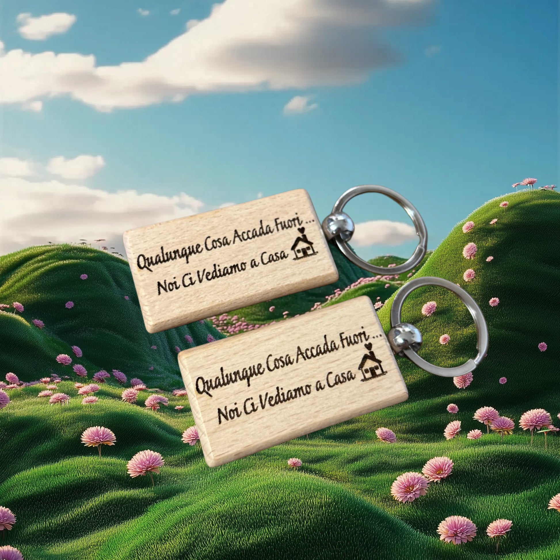 Coppia di portachiavi incisi personalizzabili nel retro (Qualunque cosa accada fuori... noi ci vediamo a casa)